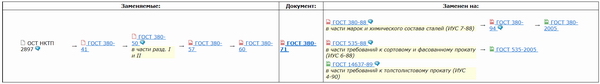 Реализована "История жизненного цикла и замен документа" (рис. 1) или "Преемственность документа (рис. 2). Отследить историю изменений любого стандарта теперь легко и просто. Вся информация о жизненном цикле документа собрана в одной удобной таблице в комментариях к каждому нормативу.